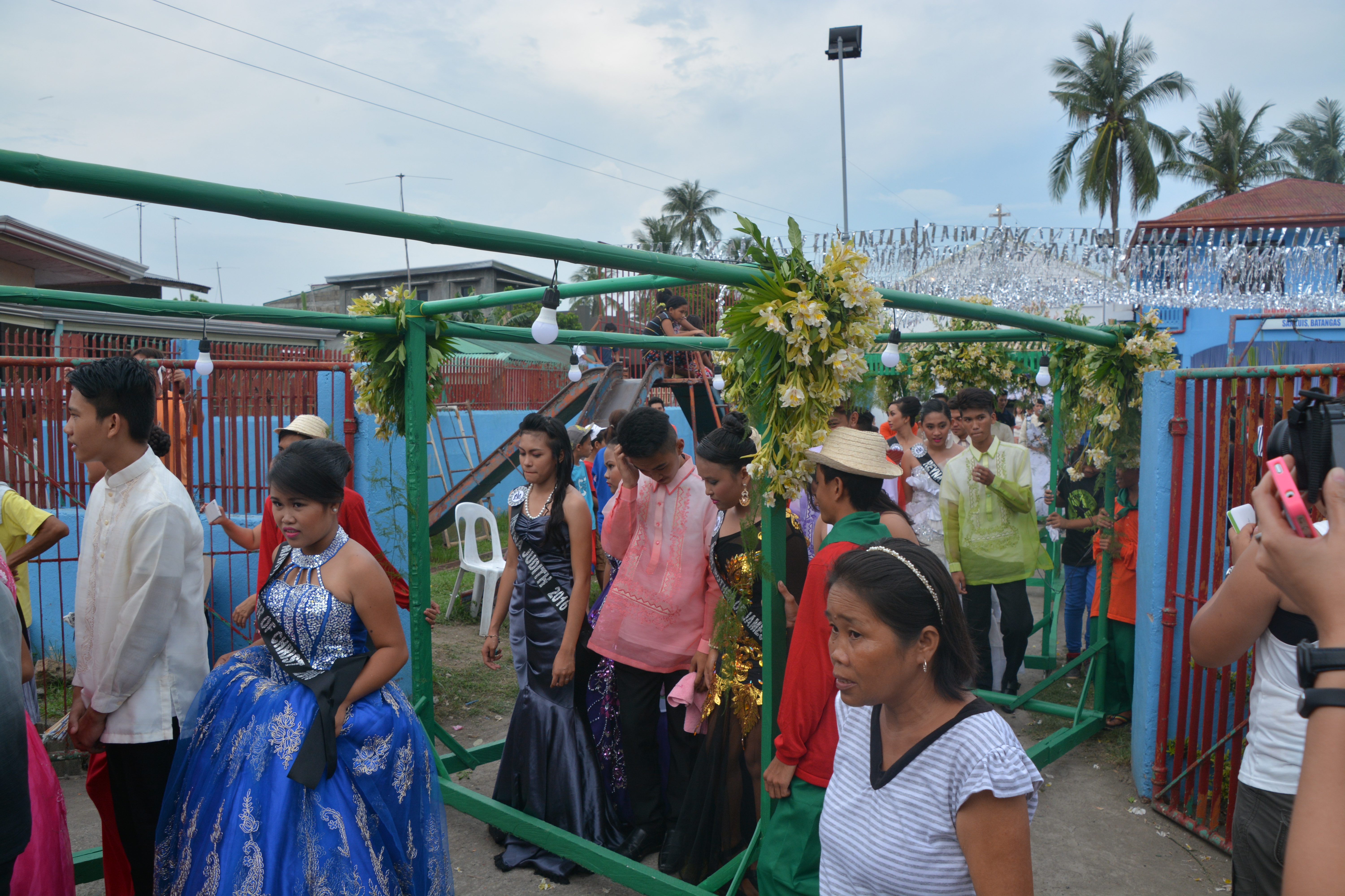 Traditionally, the santacruzan is a parade or a ritual pageant where young women don costumes of elaborate gowns, representing mythical characters, historical and cultural figures, and different names attributed to the Virgin Mary. Accompanied by the townsfolk singing devotional songs for the Virgin Mary (often the popular Latin prayer “Dios te Salve” and “Ave Maria”) and by young men (commonly family members) holding sulô (torches) to illuminate the night, each woman is accompanied by two men carrying an arko, a decorated bamboo arch covered with colorful flowers and papier mâché. On top of each arch is the character title the muse represents. At the end of the pageant is the court of Reyna Elena and her son Constantino guarded by a group of 12 men, commonly called dose pares.