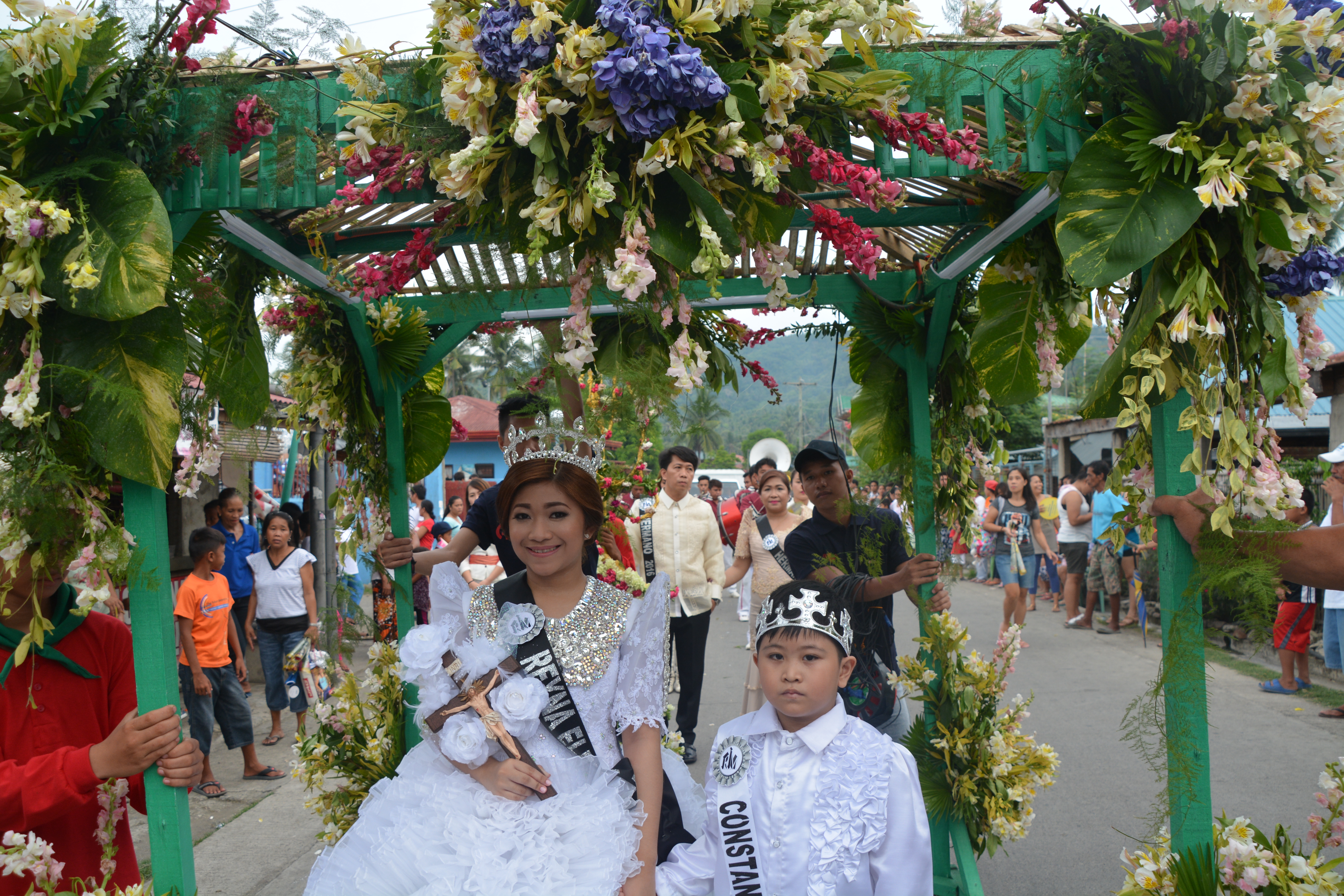 The santacruzan is a popular cultural performance in the Philippines performed in different Catholic communities of the archipelago during the month of May. The month of May in the Philippines is a transitory period from the heat of the dry season to the start of the wet season (or the monsoon) locally known as the tag-ulan. In Abe Florendo and Zardo A. Austria’s coffee-table book Sagala, Florendo and Austria describe the month as a period in the archipelago when “the blazing tropical sun turns the fields of grain into golden brown and coaxes the flowers to bloom and the fruits to ripen on the boughs, suffusing the air with a fresh fragrance — in farms and homes, at elegant banquet tables and modest vendors’ stalls — and tempting everyone with a luscious fleshiness,” signifying the festive environment that the season brings to the community. May is also popularly known as the month of flowers in the archipelago.