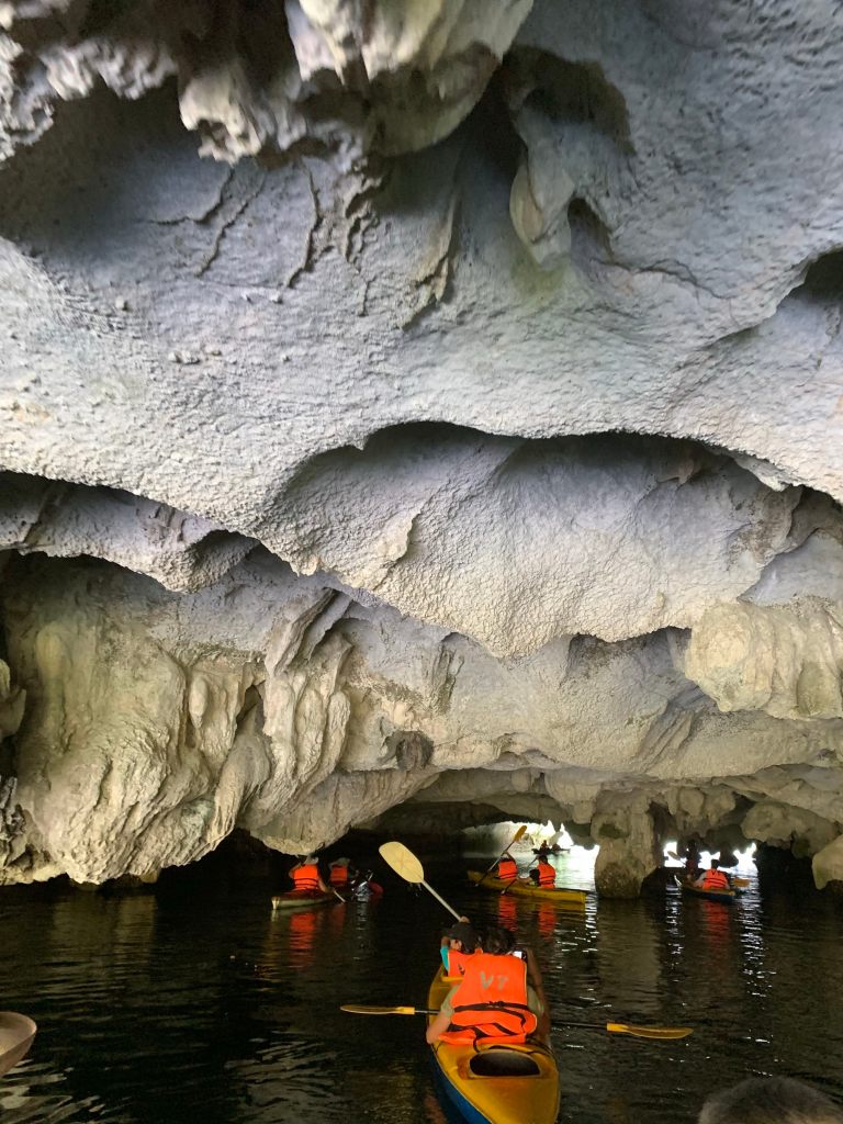 Anyhow, we cruised the Ha Long Bay, a UNESCO World Heritage Site and the most popular natural travel destination in Vietnam if not the entire mainland Southeast Asia. According to our guide, Ha Long means “descending dragon.” Most of the islands along the bay are distinctly shaped like dragons descending from the waters. Our guide also told us that once upon a time, it was even reported in a French newspaper or magazine that during the colonial era in Vietnam, the colonizers (the French) mistook the islands made of limestone karsts as dancing dragons.