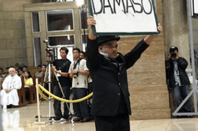 Celdran’s performance was simple. During an ecumenical service at the Manila Cathedral attended by Church leaders (such as Manila Archbishop Gaudencio Cardinal Rosales, and the Papal Nuncio Archbishop Edward Adams) and some government officials (including then Manila Mayor Alfredo Lim), Celdran dressed as Jose Rizal (black suit, black pants, and a top hat) and stood before the altar with a sign bearing the word “DAMASO” – the villain in Rizal’s Noli me Tangere. The service was interrupted. Mayor Lim had Celdran arrested. In Evelyn Macairan’s (2010) report, Celdran was described as calm when he was arrested, and once policemen brought him outside the premises of the Cathedral, he began shouting that Church officials need to “hear the Filipinos are saying: that 90 percent of the people want the RH” (Macairan 2010). Celdran was detained at Manila City Jail and later the CBCP charged him under Article 133 of the Revised Penal Code of the Philippines for “offending religious feeling.”14