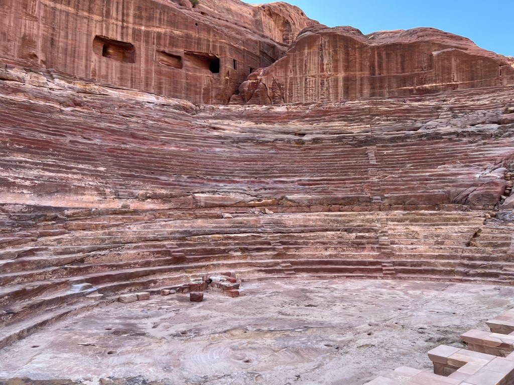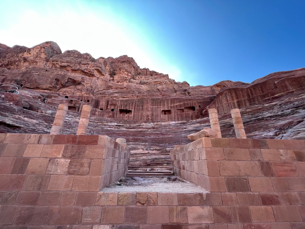 The amphitheater is one of the most recent structures of the city, dating around late 1st century CE. It was built during the time Petra was under the imperial rule of the Byzantine Empire. A huge part of the theater was carved out of solid rock, while the main stage and the exterior wall were artificially constructed. The auditorium consists of three horizontal sections of seats separated by passageways and seven stairways to ascend, as noted in the information booklet. The theater could accommodate a number of approximately 8500 people and follows similar architectural patterns of Roman theaters, which enhances superior acoustics. I have no accurate proof about this claim because visitors are also not allowed to enter the theater.